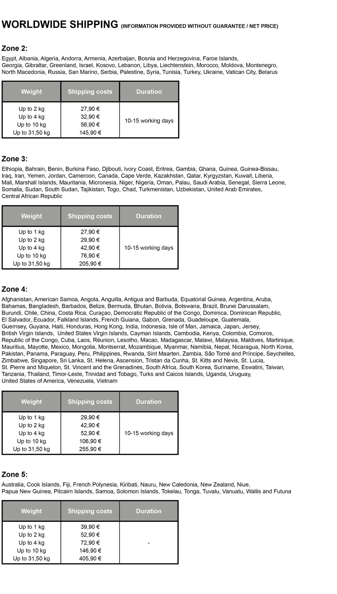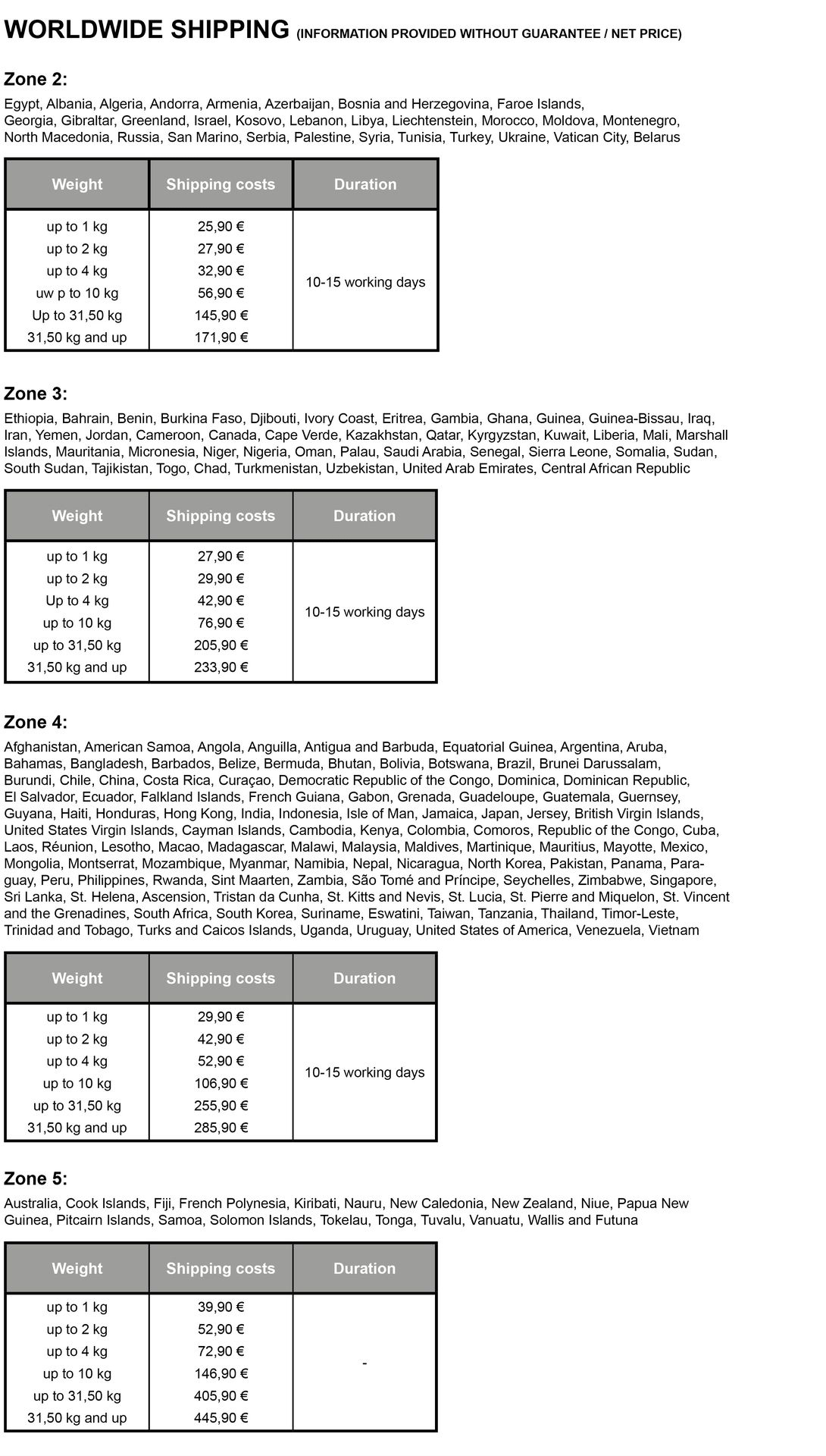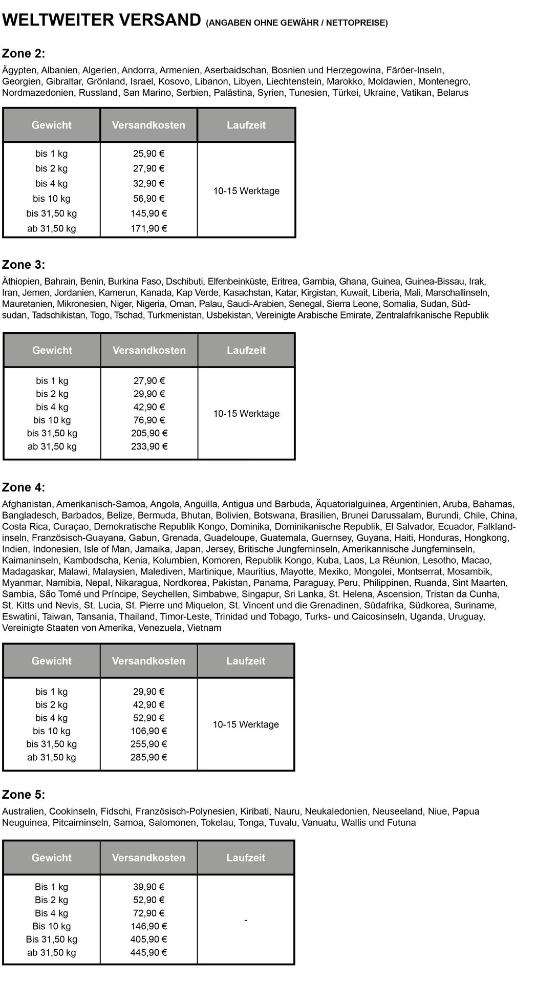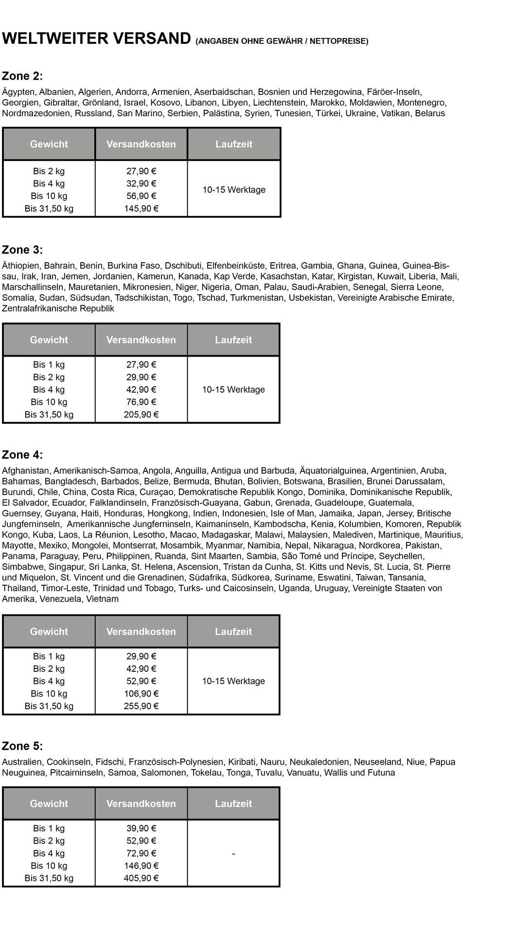 Versandkosten weltweit