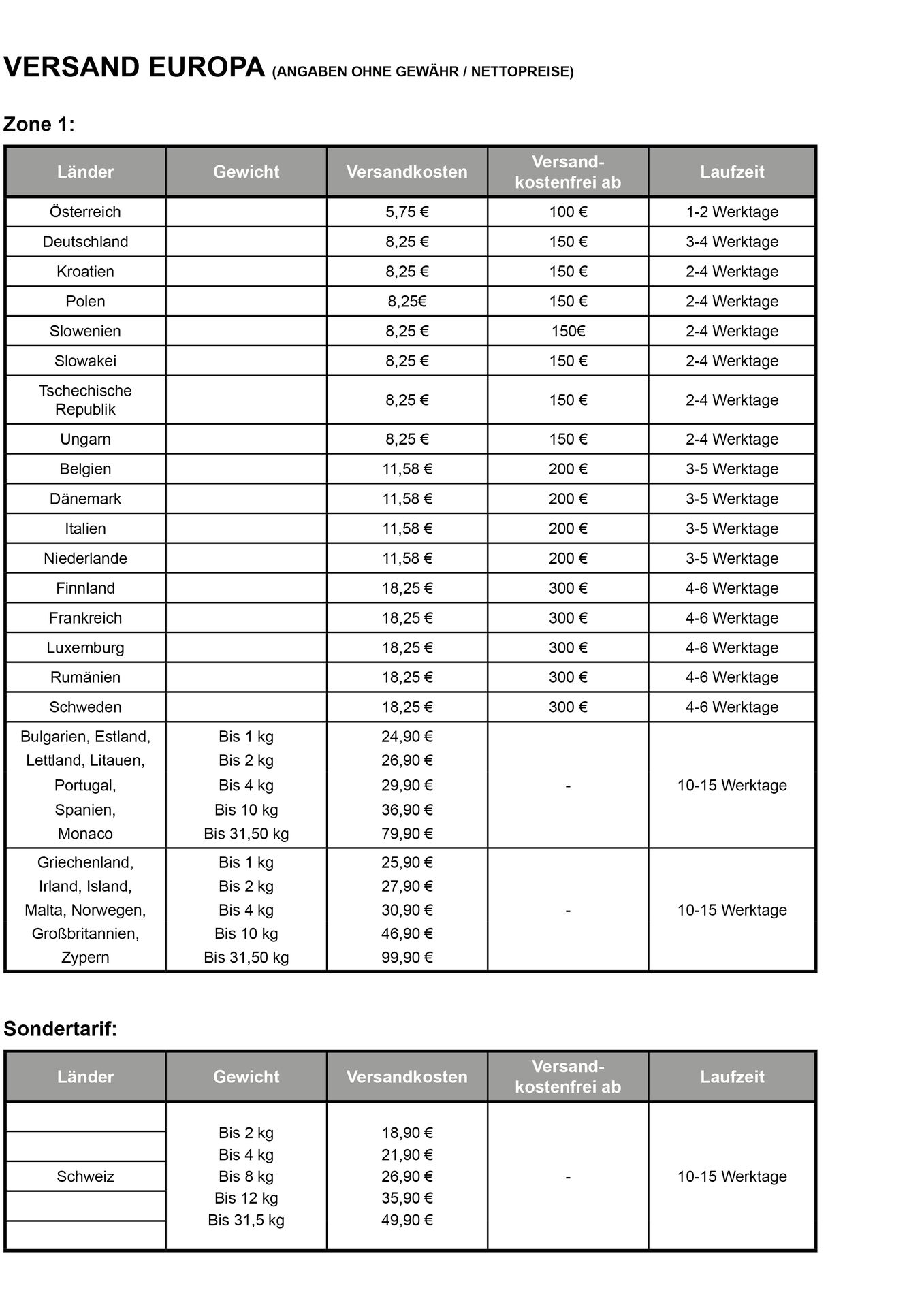 des jeweiligen Landes angezeigt. Die Steuer und allfällige Zoll- und Einfuhrabgaben sind vom Empfänger / Importeur der Ware zu tragen. Diese