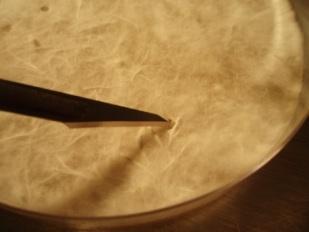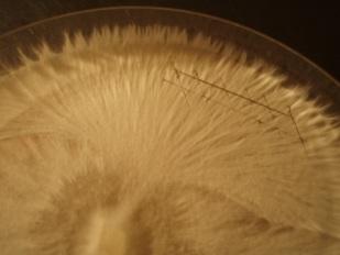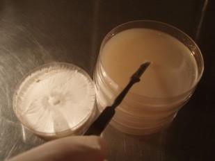 Auf der Skalpellklinge soll nun je eines dieser Myzelstücke heraus gehoben und in eine neue Petrischale auf Agar-Nährboden gelegt werden.