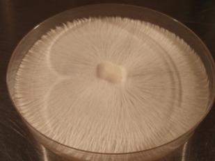 Aus der mit Myzel bewachsenen Agarplatte wählt man eine rhizomorph wachsende Stelle und schneidet mehrere etwa 3x3 mm große Stücke heraus.