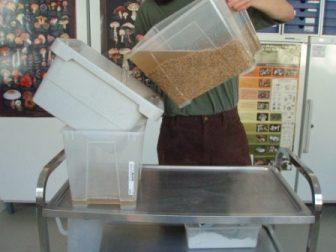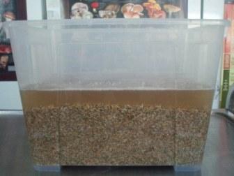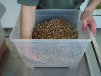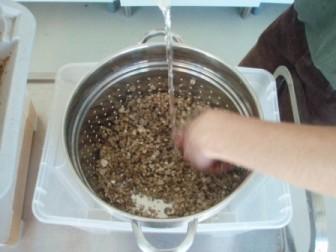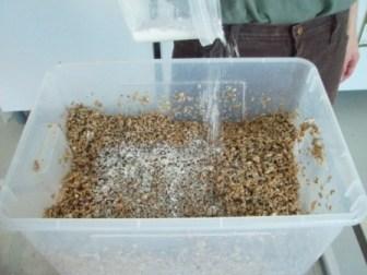 Das Wasser muss mindestens 4 bis 5 cm über dem Roggen stehen. Am nächsten Tag soll der Roggen abgeseiht werden (z. B. mit einem Sieb oder einem Behälter mit geeignet großen Löchern – so, dass kein Roggen-Korn, aber das Wasser durchkommt). Das Ganze ca. 15 Minuten stehen lassen und das überschüssige Wasser abtropfen lassen. Während der Roggen abtropft, kann das Vermikulit „medium“ in einem passend großen Sieb angefeuchtet und gemischt werden. Es soll so viel Wasser hinzugegeben werden, bis das Vermikulit nach ca. 10 Minuten nicht mehr abtropft. Nun wird der Roggen gut mit der entsprechenden Menge Gips vermischt. Als letzten Schritt wird dann das angefeuchtete Vermikulit darunter gerührt und alles noch einmal gut durchmischt.