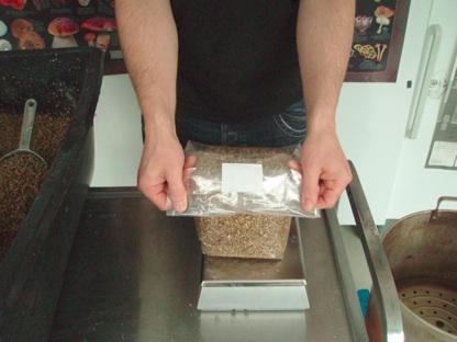 Krempeln Sie das Autoklav-Bag ca. 10 cm um und füllen Sie 3 kg der fertigen Mischung ein. Bitte darauf achten, dass der obere Bereich des Sackes beim Befüllen nicht mit Substrat beschmiert wird (eventuell mit einem alkoholfeuchteten Tuch reinigen). Jetzt klappen Sie den Sack 2 Mal ein (Filter nach innen).